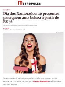 O site Metrópoles publicou mais uma vitrine com sugestões de presentes para o Dia dos Namorados com kits e itens O Boticário entre as opções.