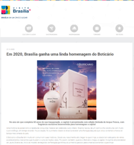 A fragrância exclusiva e limitada, Acqua Fresca de Brasília, do Boticário, foi destaque em publicação do site Visite Brasília. Confira a publicação aqui.