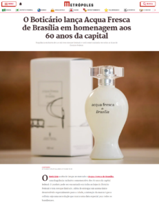 O site Metrópoles divulgou o lançamento da nova fragrância exclusiva e limitada, Acqua Fresca de Brasília, uma homenagem do Boticário aos 60 anos de Brasília.