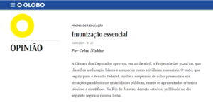 O diretor presidente da Associação Brasileira de Mantenedores de Ensino Superior (ABMES), Celso Niskier, teve o artigo “Imunização essencial” publicado em O Globo. Confira íntegra