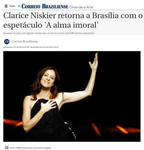 Clarice Niskier retorna ao palco do Teatro Brasília Shopping para mais uma temporada na cidade com o espetáculo A Alma Imoral. A atriz desconstrói e reconstrói