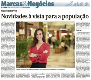 A nova gerente de marketing do Taguatinga Shopping, Maíra García foi destaque na coluna Marcas & Negócios do Correio Braziliense. O texto traz novidades sobre