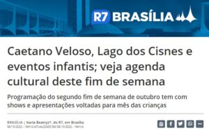 O R7 Brasília citou as programações especiais do Taguatinga Shopping e do JK Shopping para o Dia das Crianças em sua agenda cultural. Clique aqui